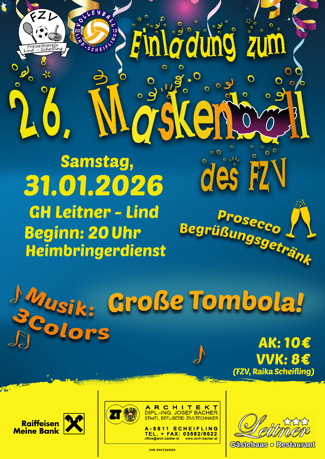 Einladung zum 26. Maskenball des FZV Lind mit Begrüßungsgetränk, großer Tombola, Musik 3 Colors, Heimbringerdienst - s. Bild