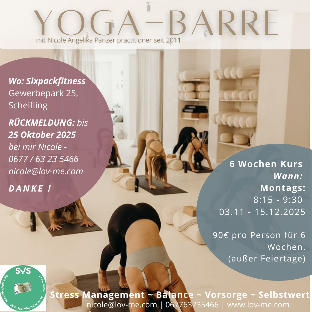 - Montag Vormittags Yoga Barre Kurs 8:15 - 9:30 ab 3. November bis 15. Dezember