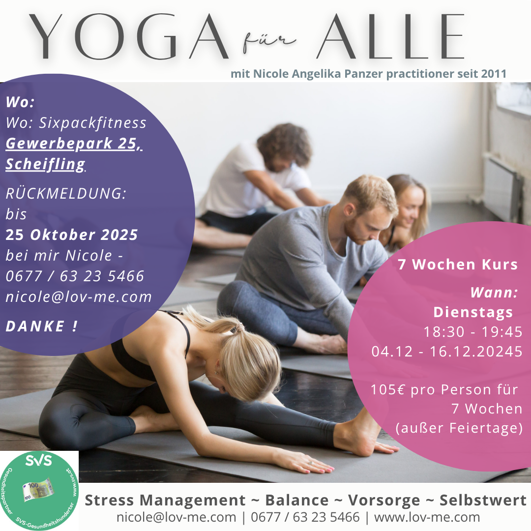 - Dienstag Abends Yoga für Alle 18:30 - 19:45 ab 6. November bis 16. Dezember