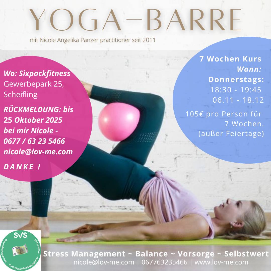 - Donnerstag Abends Yoga Barre Kurs 18:30 - 19:45 ab 6. November bis 18. Dezember